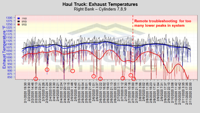 The RemoteCare team received an alert from the MineCare system about frequent low exhaust temperature events in cylinder 9 of the right bank of a haul truck.
